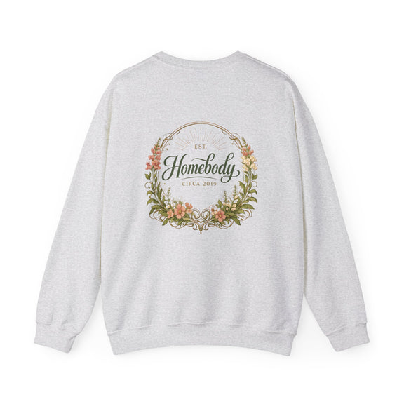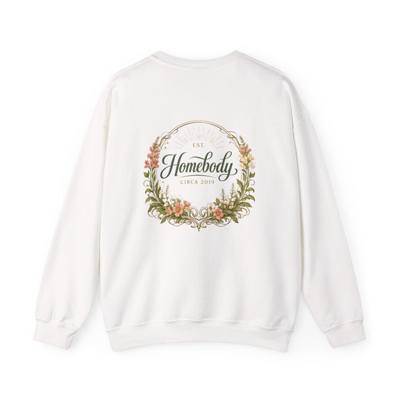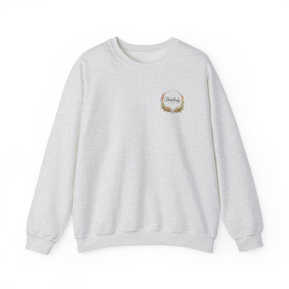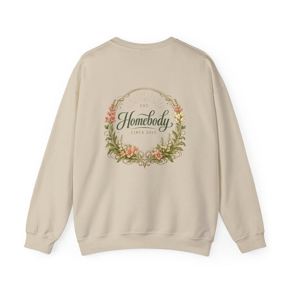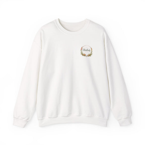 Soft, warm, and quietly charming—this crewneck wraps you in easy comfort while celebrating the slow joy of home life. A subtle embroidered badge sits over the heart, while a larger, painterly wreath and hand-lettered "Homebody" design rests across the back. The result feels like a cozy afternoon by the window: warm tea, worn-in books, and the calm assurance of a place that grounds you.